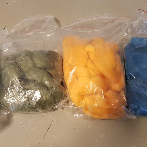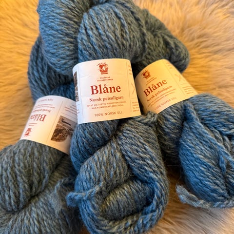 Blåne Pelsullgarn . Alle har samme innfarging. Ny pris er kr 139,-pr hespe.