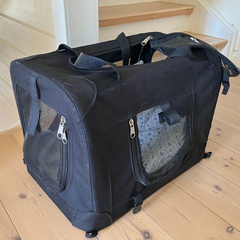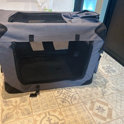 Richo sammenleggbar hundebur i blå og grå farge. Buret har nettingvinduer på flere sider for god ventilasjon og oversikt. Egnet for transport og midlertidig opphold for hunder.