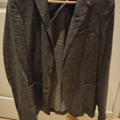Ubetydelig brukt dressjakke med bukse selges. Kjøpte i italia. Står str 46, men det er den ikke. Mer en s. Passer til smal konfirmasjonsgutt. Stilig grå med smale striper. Tynt, luftig veldig godt stoff.