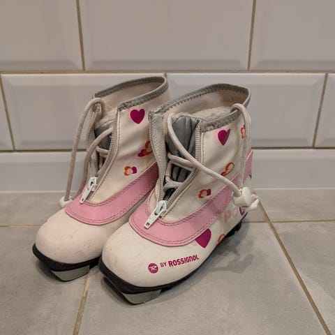 Rossignol skisko for barn i størrelse 28. Støvlene er svart med blå detaljer. Snøring og glidelås.