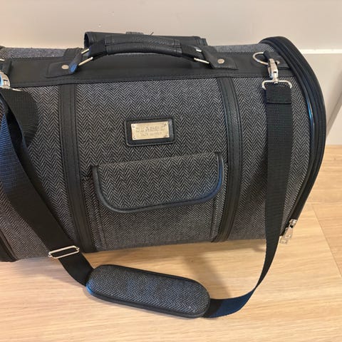 Grå bæreveske med skulderstropp og nettingpaneler for ventilasjon. Vesken har flere lommer med klaff foran og glidelås på toppen. Materialet er tekstil, og vesken er egnet for transport og oppbevaring av små kjæledyr. For eksempel på fly.