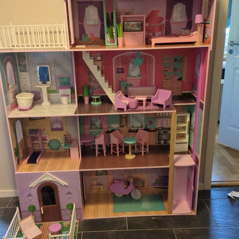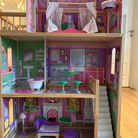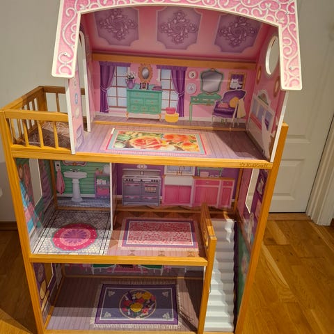 Barbie dukkehus i tre med flere rom og møbler. Dukkehuset har flere etasjer med detaljerte rominnredninger og er laget for barnelek.