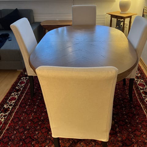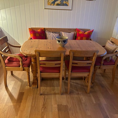 Pent brukt spsestue/M 6 stoler og 2 tilleggs plater på 50cm. Total lengde på bordet er 280 cm.