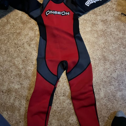 Oneeon våtdrakt for barn i fargene rød og svart. Laget i neoprenmateriale, designet for å gi isolasjon og beskyttelse ved vannaktiviteter. Passer for barn og har glidelås bak for enkel påkledning.126cm for barn fra 5-6 år