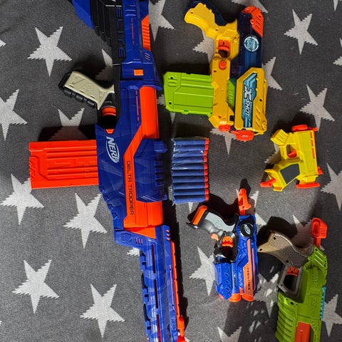 Nerf Elite 2.0 Volt og Micro Shots barneskyttere i flere farger. Settet inkluderer ulike modeller med tilhørende dartpiler, laget i plastmateriale. Egnet for lek og utendørs aktiviteter for barn.