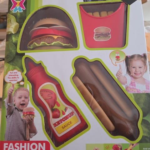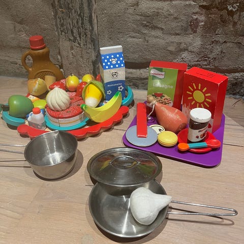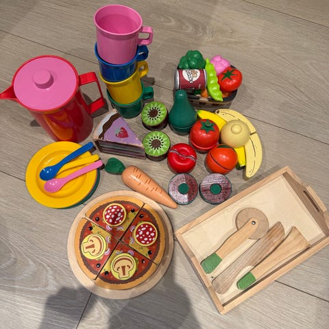 Sett med lekemat i plast som inkluderer ulike grønnsaker og kjøkkenredskaper. Passer for barn som ønsker å leke matlaging og utvikle motoriske ferdigheter.