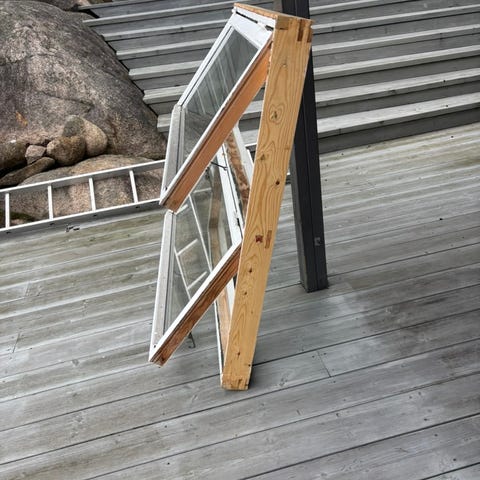 Vindusramme i tre med flere ruter. Rammen er hvitmalt og har slitasje som vises på bildene. Passer til utskifting eller gjenbruk i bygg eller restaureringsprosjekter.