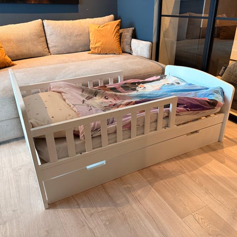 «Juniorseng fra JLY med et klassisk design. Den har paneler i sidene som hindrer barnet i å rulle ut av sengen og et praktisk lagringsområde under. Perfekt til barnerommet.
