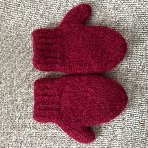 Har to par hvite tovede ullvotter. Det minste er 16 cm langt og passer barn 3-4 år. Det største paret er 17 cm langt og passer best 4-5 år.