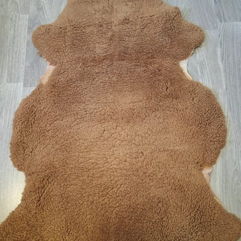 Dette er et brunt saueskinnsteppe. Høyde 100cm og brede 65cm