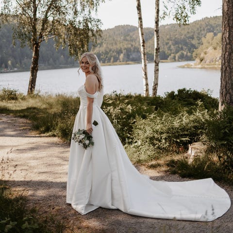 Selger min brudekjole kjøpt ny i september 2025 fra «drømmekjolen brudesalong». Ordinær pris står på lappen på bilde 9, men jeg kjøpte den på tilbud for 18 000kr. Har kvittering som følger med. Brukt en gang i september 2025. Renset etter dette og ikke tatt ut av plasten siden. Ingen skader eller flekker. Vil si at dette er en S/M i størrelsen. Jeg er 167 og tilpasset lengde etter dette. Nydelig brudekjole med masse fine detaljer og litt glitter i skjørtet. Underskjørtet er i champagne farge noe som gjør den perfekt for høstbryllup men veldig fin resten av året også. pris kan diskuteres.