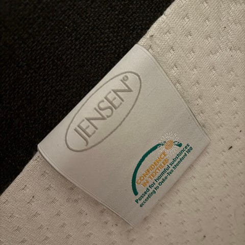 Jensen Pulse sengemadrass med hvitt trekk. Madrassen er designet for bruk i senger og har et trekk sertifisert i henhold til Oeko-Tex Standard 100, som indikerer at den er testet for skadelige stoffer.