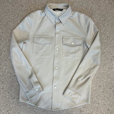 Stilren hvit skjortejakke fra H&M, ubrukt og i størrelse S. Laget i en blanding av 66 % polyester, 22 % bomull og 12 % viskose. Myk og behagelig kvalitet med enkel og tidløs design.