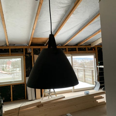Collage 450 fra Louis Poulsen i nydelig blågrå farge selges. Hvit variant selges på Illums til over 10.000 kr. Den blå kan jeg ikke se er i salg lenger. Ingen synlige merker på lampen. Hvit stoffledning medfølger. Må hentes