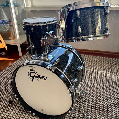 Selger et flott Gretsch New Classic Maple trommesett/shellpack i typiske bop størrelser - 18 kick, 12 racktam inkl tamholder til stortrommen og 14 gulvtam inkl bein. Veldig velholdt, vellydende og solid sett som ser flott ut og har den riktige Gretsch viben. Har ikke sett mange slike sett til salg og vil nok påstå at dette er en ganske sjelden mulighet.