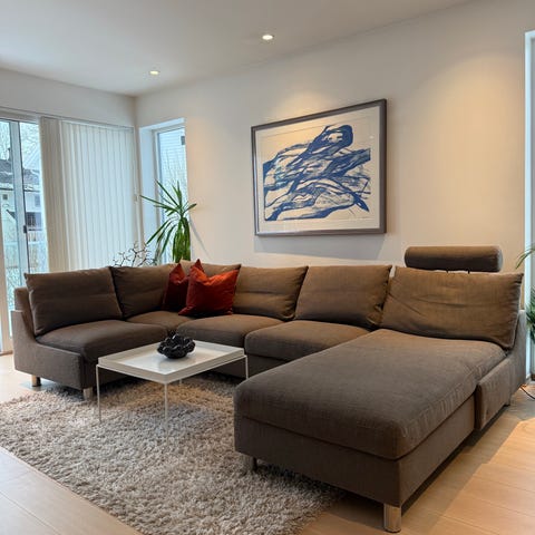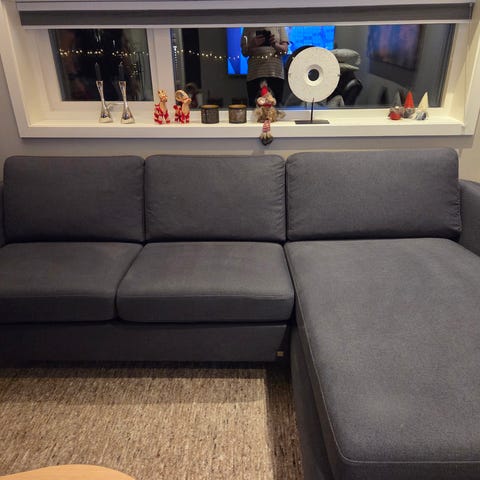 Stordal hjørnesofa i grå stoff. Sofaen har et moderne design med rette linjer og gir god sittekomfort. Passer for bruk i stue eller oppholdsrom. Ingen flekk og ingen skade. Helt som ny. Helt perfekt skum madrasser. Sofaen har ekstra madrasstrekk i blågrå og grålilla farge (11 stk per farge).