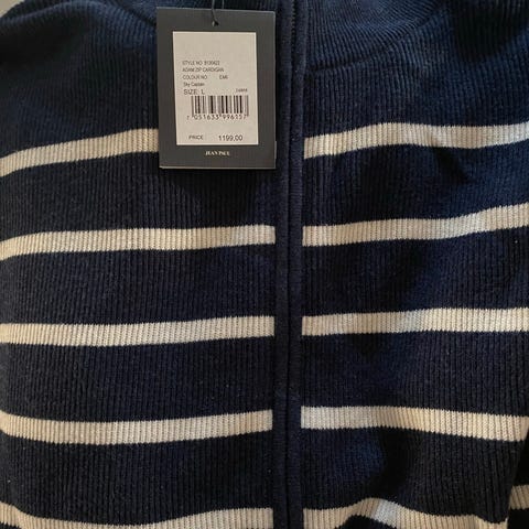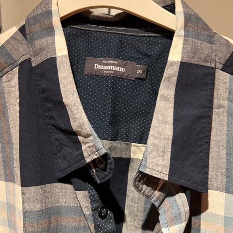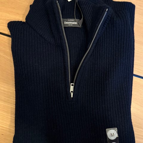 Ubrukt Dressmann genser med zip-glidelås i halsen i størrelse 3XL stripet hvit og navy-blå. Laget av bomull.
