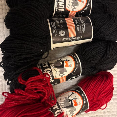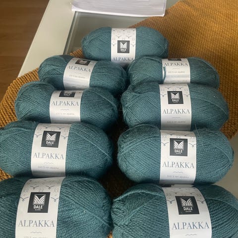 Div garn, både uåpnede og rester av nøste. I hjem uten røyk eller dyr. Garn type Rauma finull, DSA Mini Alpakka, Sandnes Alpakke, Tove, Sterk mm.