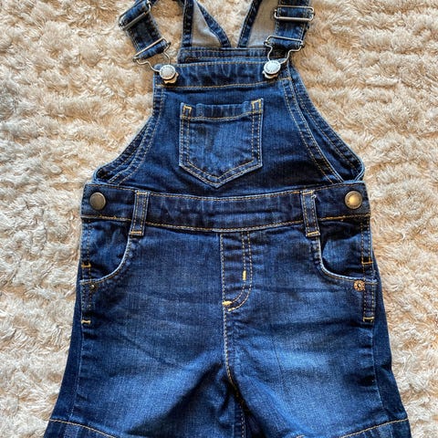 Selger snekkersbukse fra M&S. Størrelse 1 - 1,5 år (12 - 18 mnd). Knepping under for enkelt skift av bleier. Lett å ta på med regulerbare seler. Kun brukt 2 ganger.