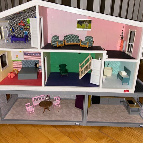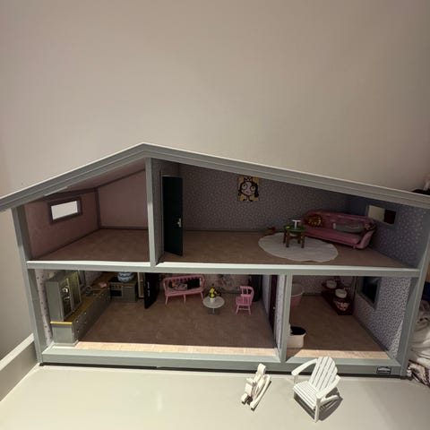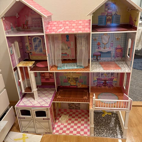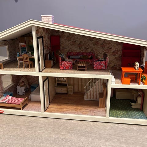 Lundby dukkehus med flere rom og møbler. Laget i tre og malt i flere farger. Passer som leke- og oppbevaringsplass for barn.
