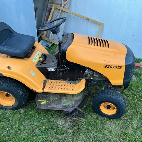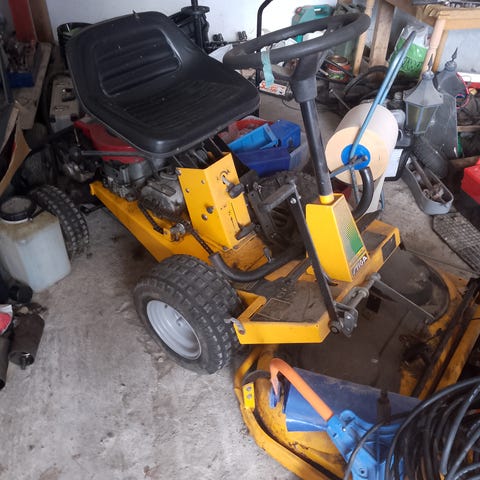 Stiga hage traktor med gressklipperfunksjon. Utstyrt med motor, sete og ratt for enkel styring. Designet for effektiv gressklipping i hager og mindre områder. Reparasjonsobjekt uten klipperpanne.