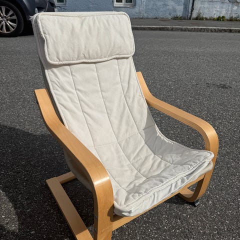 IKEA Lenestol til barn med trestruktur og beige trekk. Passer som sittemøbel for barn. Trekk er litt ødelagt og har noen merker.