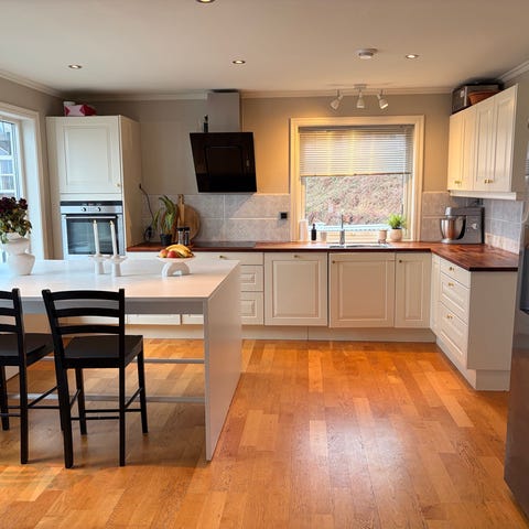 Kjøkkeninnredning med svarte skap og trebenkeplate