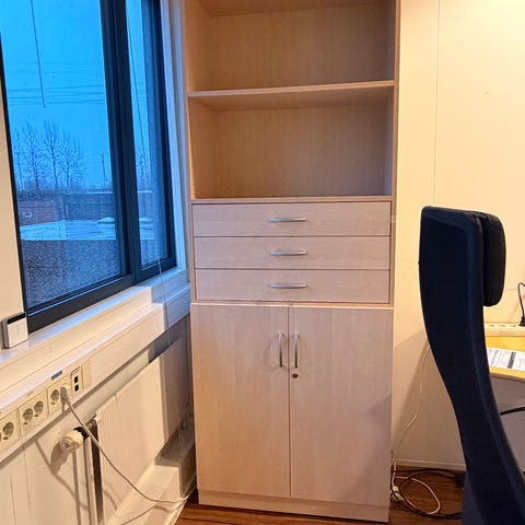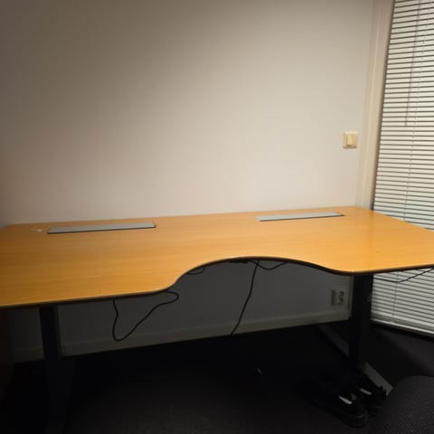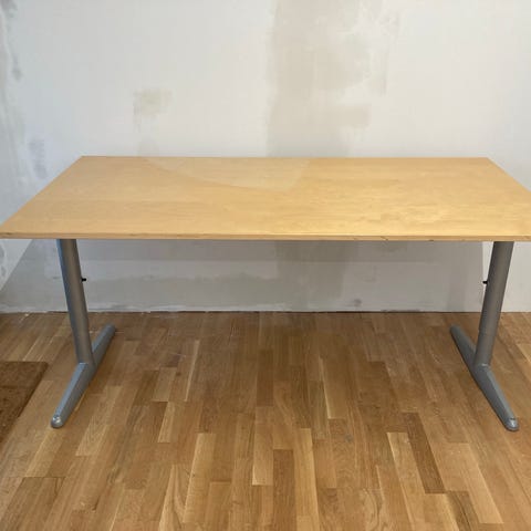 Hev og senk arbeidsbord med 120 cm i bredde og 80 cm i dybde gis bort. Elektrisk bord hvor hev og senk fungerer, mulighet for å feste ledninger under bordet. Bordet er tungt med grå bein. Bordet må hentes.