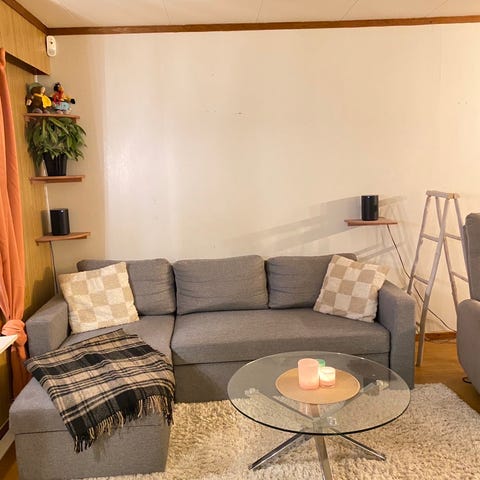 Nett og pen 3 seter sofa m- sjeselong. Pynt, uten merker eller skader. Har stått i loftsstue og er lite brukt. Grå farge, og i tekstil. Sittehøyde 46 cm. Dybde på side med sjeselong 150 cm. Må hentes. Kjøpt på Skeidar.