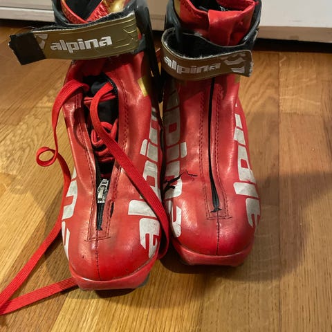 Alpina skisko i rød og svart farge. Skøytestøvlene har borrelås og glidelås for lukking, og er foret med mykt materiale for komfort.