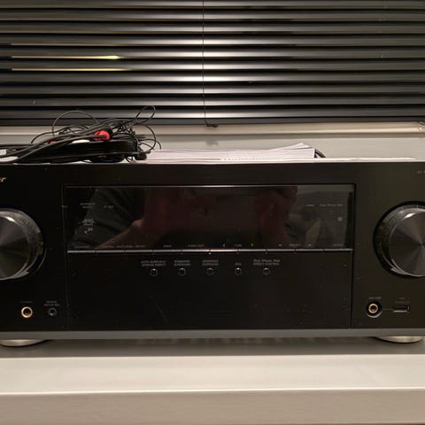 Pioneer AV-receiver VSX-LX52 med fjernkontroll og strømledning.