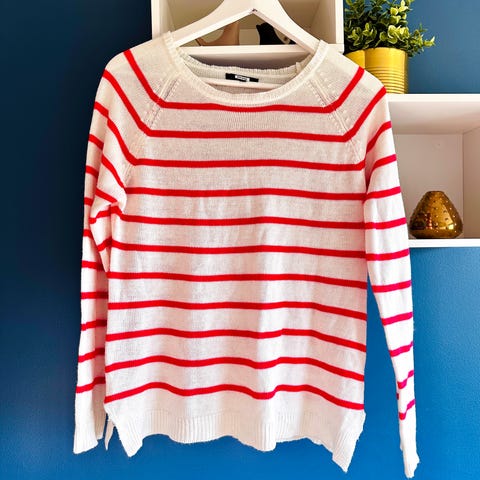Maison Scotch genser i størrelse 2 (M) for dame. Genseren er flerfarget med mønster i hvitt, svart og oransje.
