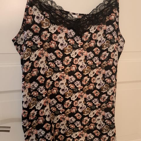 Den er i størrelse L, lengde fra topp til bunn er 51 cm, brystvidde ( målt rett under armene) er 43 cm
