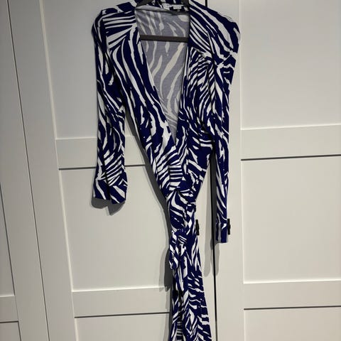 Diane von Fürstenberg kjole i størrelse S, blå farge, laget i blondestoff. Kjolen har trekvartlange ermer og glidelås foran. Egnet som fest- eller selskapskjole.