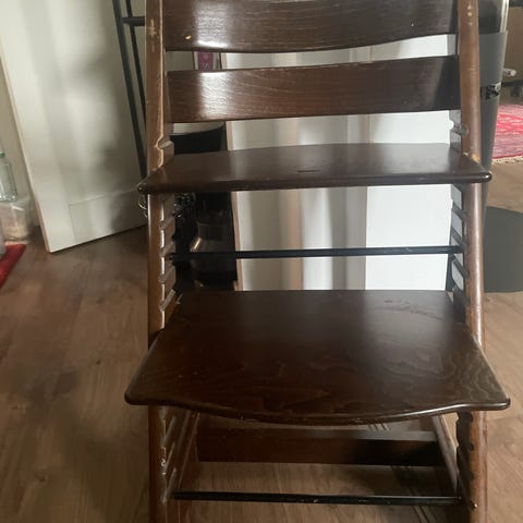 Selger en malt tripp trapp-stol av gammel type. Obs! Setet mangler, selges derfor billig.