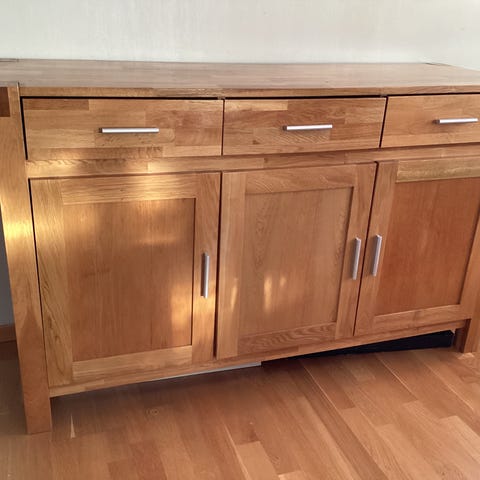 Pent brukt, med noen bruksmerker, se bildene. Kan nok pusses, oljes eller males og bli i topp stand. Dette hylleseksjon av høy kvalitet.