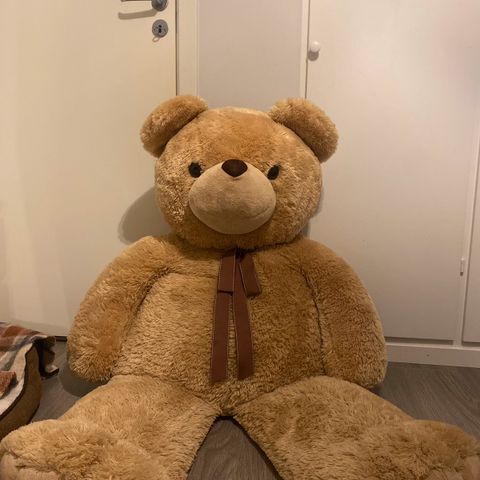Stor bamse i god kvalitet (110 cm høy). Kjøpt ny hos Extra Leker. Ikke lekt med, ikke sovet med, kun stått til pynt i et TV-rom som ikke brukes. Fremstår som ny, uten bruksmerker.