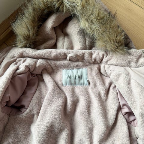 Fin vinterjakke i str. 140. Lyserosa farge. Viser vanlige bruksspor, ellers veldig fin.