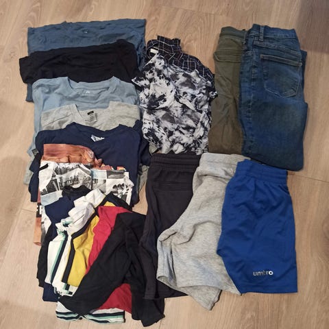 Stor klespakke str 146-152, alt i bra stand. Ingen hull, manglende knapper etc. Det følger med tre ulike lyseblå skjorter, den ene str 146, de to andre 152. Eksempler på merker er Polarn o Pyret, Lindex, Hummel + andre.