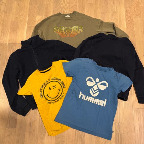 Tre gensere og en t-skjorte, klespakke selges samlet str 134.