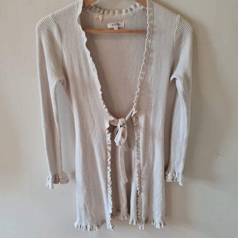 byTiMo Cardigan i beige / gammelrosa farge, laget av bomull. Str S. Lenden er over enden. Langermet design med knappelukking foran og to små lommer. Ribbestrikket materiale.