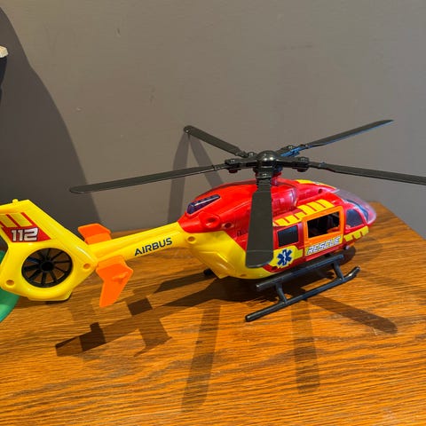 Leketøy helikopter i gul farge med svart og grønn rutemønster på siden. Modellen er ukjent, og produktet er laget for lek. Helikopteret har detaljer som vinduer, rotorblader og landingsskinner.