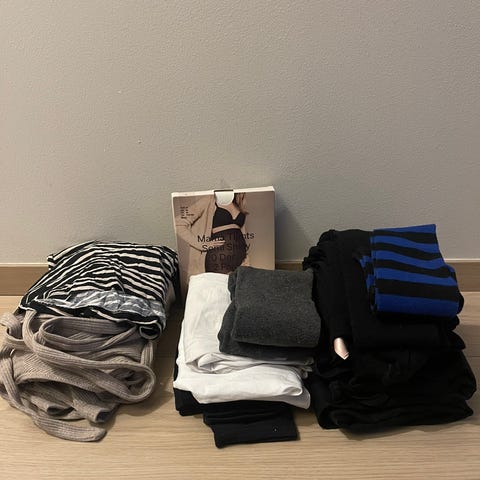 Stor klespakke for gravid. Til sammen 9 t-skjorter, 3 bukser, 2 leggings og 2 langskjorter. Alt i str M