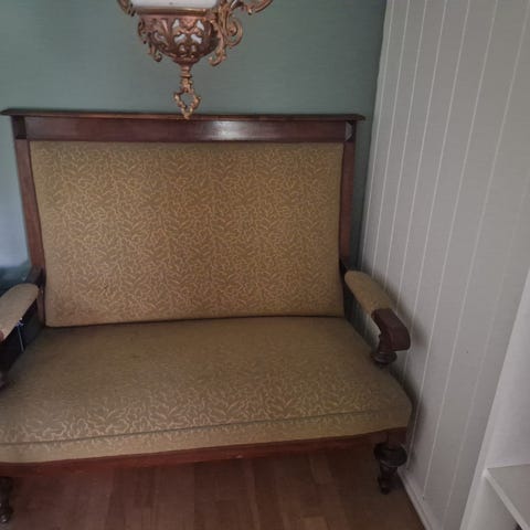 Behagelig gammel sofa brukt som sitteplass i gang. Har løse bein som må limes på igjen. Skruene i ryggen kan godt strammes litt igjen. Fjæring med tradisjonell stopping. Jutebånd