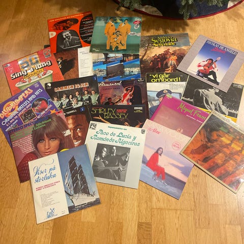 Samling av vinylplater fra ulike artister og musikksjangre.