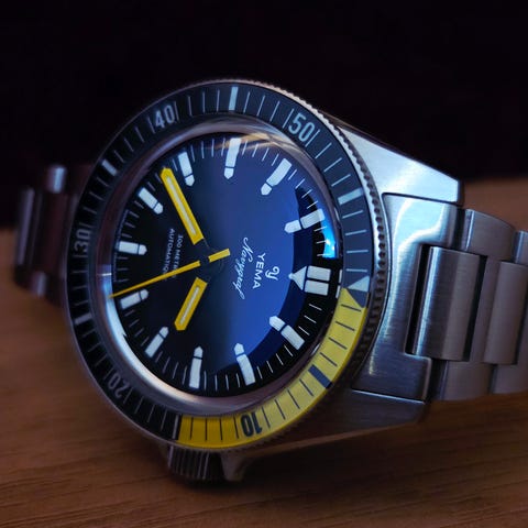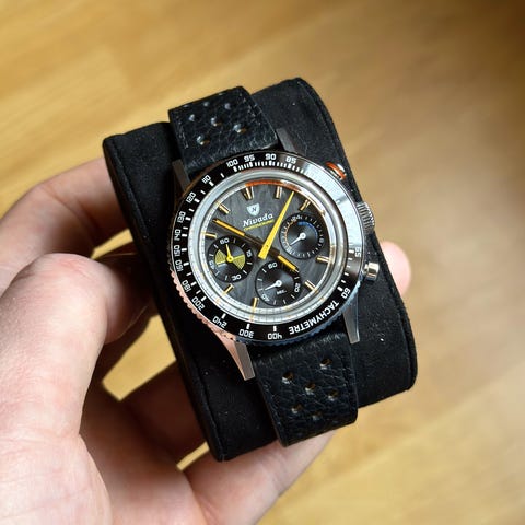 Selger denne veldig fine Yema Speedgraf x Klokkeriet på grunn av for lite armtid. Dette er en særs flott kronograf, utviklet i samarbeid mellom Yema og Klokkeriet. Her får du mye klokke for pengene!