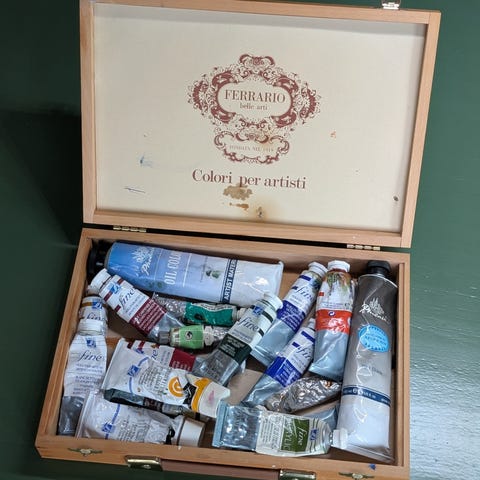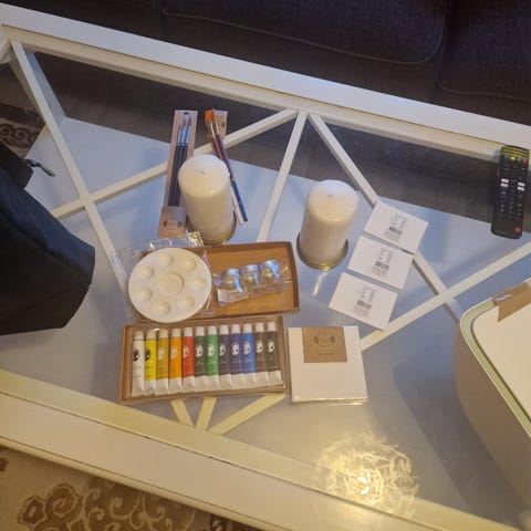 Ikke alt et med, og kun 3 ellrr 4 malinger er brukt men såvidt noe som helst av de fordi jeg bruker bare akryl og ville teste olje men var ikke for meg merket jeg med engang, så lærreta som følgte med er med ubrukt fordi jeg testet bare på malingspapir, men de knivsettene er ikke med fordi de er forsvunnet og en av penslene