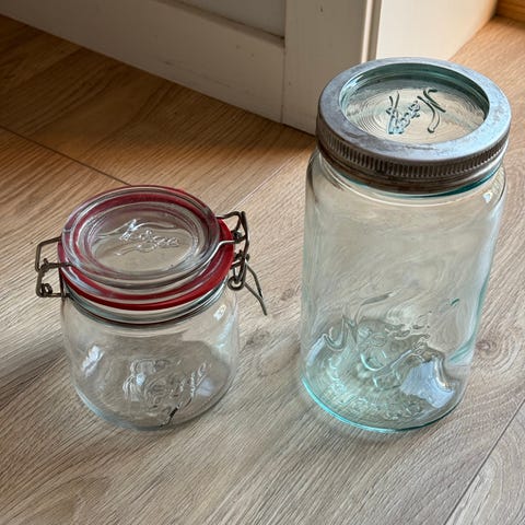 3 stk 2l norgesglass. Selges da de bare blir stående. Håper noen andre kan få glede av de 😊 litt merker på sølvringene på toppen som du kan se.