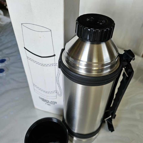Termoflaske i metall med rødt mønster. Pent brukt — i god stand. Flasken holder drikke varm eller kald, og har skrukork for trygg og enkel bruk. Litt skade på skrukorken. Selges fordi den ikke er i bruk. Kan sendes trygt med Posten/PostNord (frakt fra 25 kr) eller hentes etter avtale. Åpen for bud og rask sending.