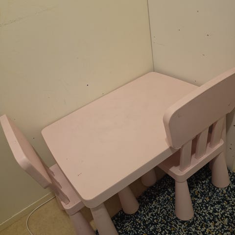 IKEA barnemøbler som inkluderer et blått bord og to stoler i blått og grønt. Møblene er tilpasset barn og egnet for bruk i lek eller som arbeidsplass for barn.